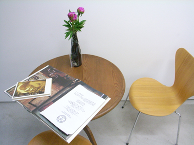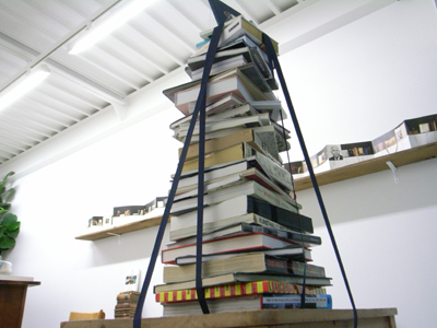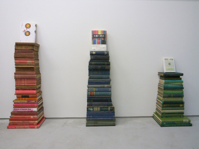 ディスプレイされていたアンティークの家具や、塔のように積まれた本。