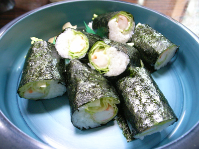 新鮮なレタスとプリップリの海老が程良く詰まった酢飯と一緒に巻かれている。