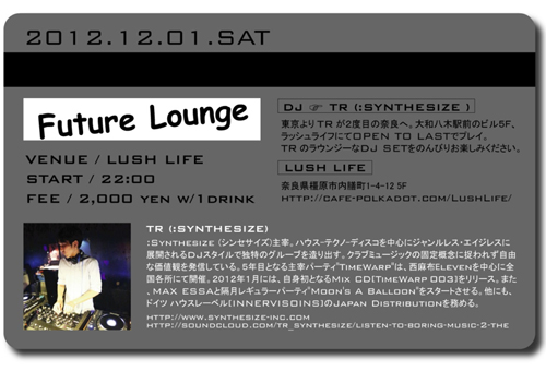 December 3, 2012 12:31 am昨日のFUTURE LOUNGEにお越しの皆様ありがとうございました!